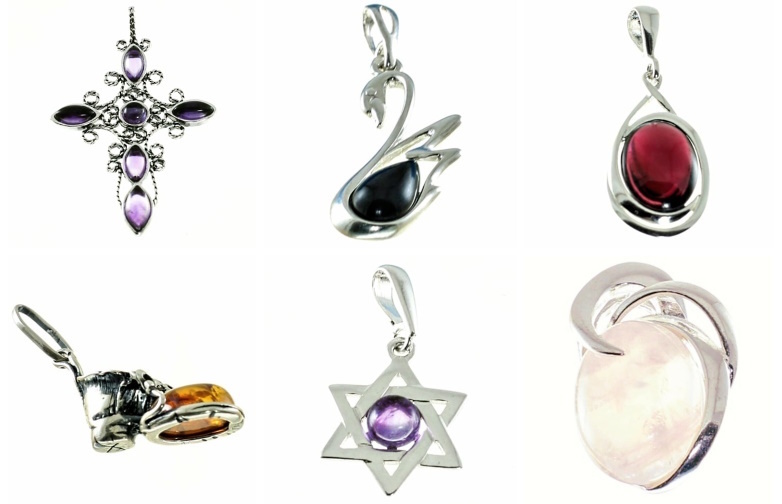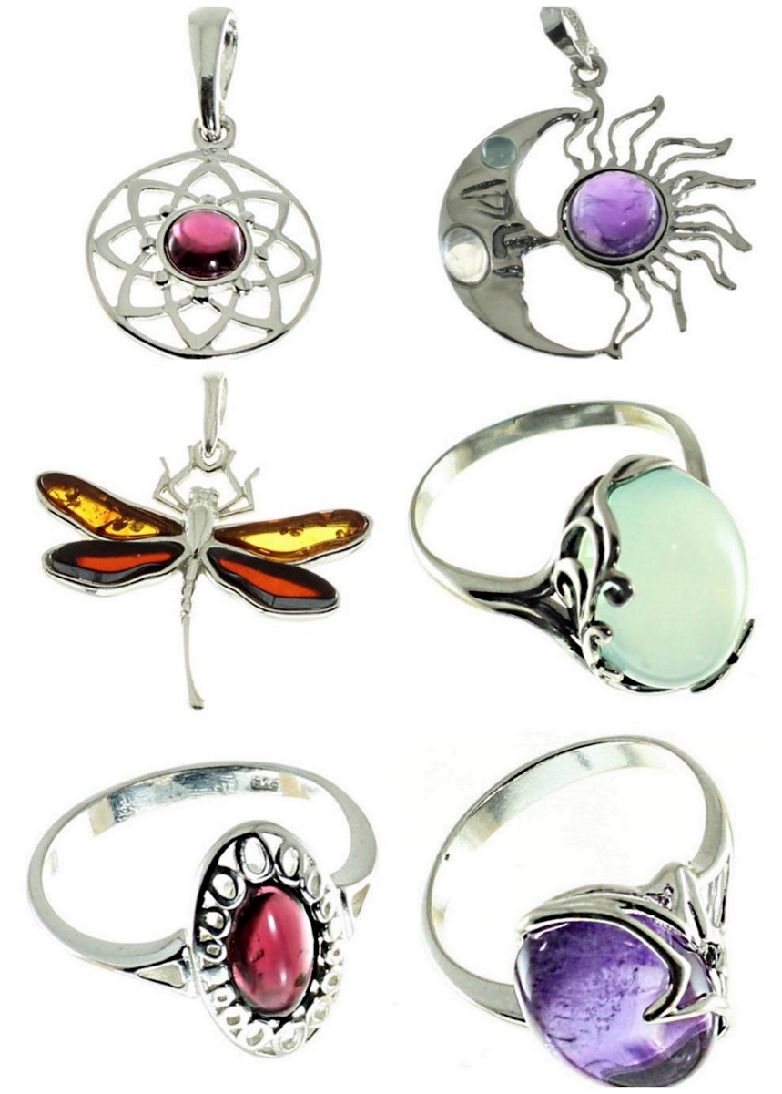 Colgantes, anillos, pulseras, pendientes, broches hechos con plata de ley