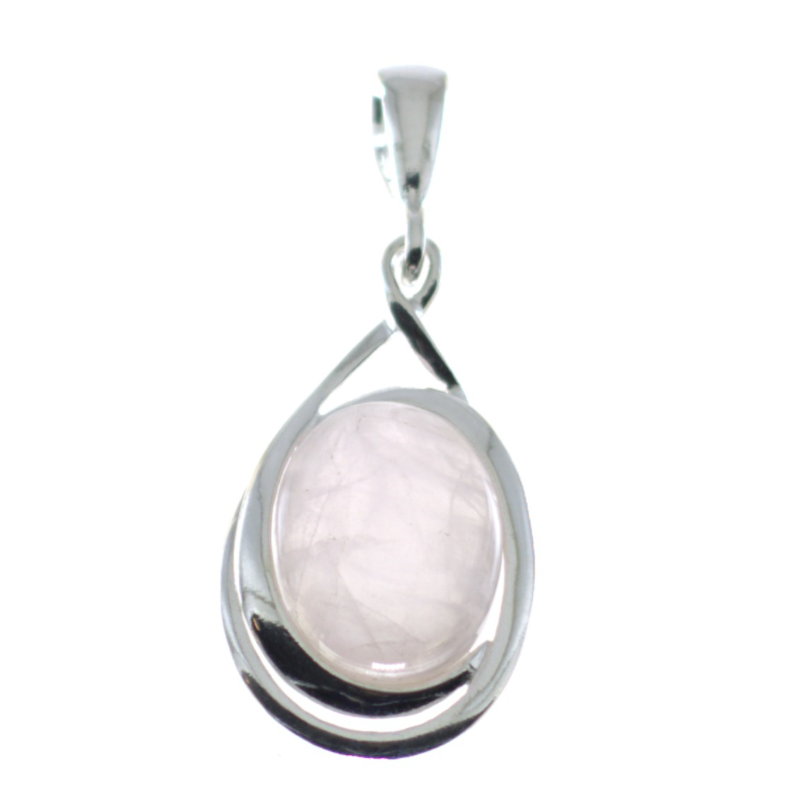Colgante de cuarzo rosa con plata de ley-925, hecho con piedra ovalada en color rosado engastada en plata lisa, clara, brillante