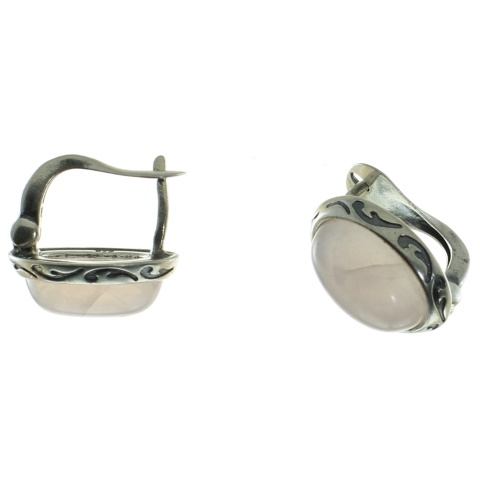 Pendientes de cuarzo rosa con plata de ley-925 hechos con piedras ovaladas en colores rosa engastadas en plata envejecida, los cierres catalanes